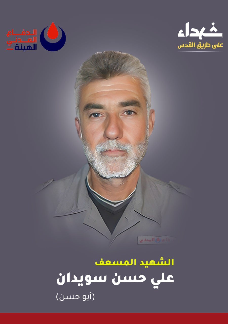 بمزيد من الفخر والإعتزاز، تزف المديرية العامة للدفاع المدني – الهيئة الشهيد المسعف علي حسن سويدان “أبو حسن” مواليد العام 1962 من بلدة عدشيت القصير في جنوب لبنان، والذي ارتقى شهيداً على طريق القدس.