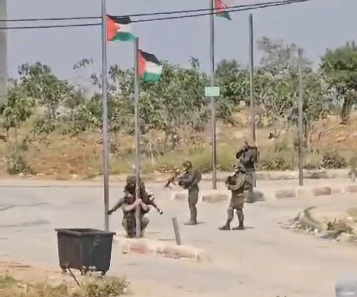 جنود الاحتلال يحاولون إنزال أعلام فلسطين في بلدة قصرة جنوب نابلس.