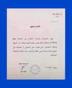 تم اصدار تعميم من نقابة المحامين حول منع استخدام تطبيق “tiktok” للمحامين.