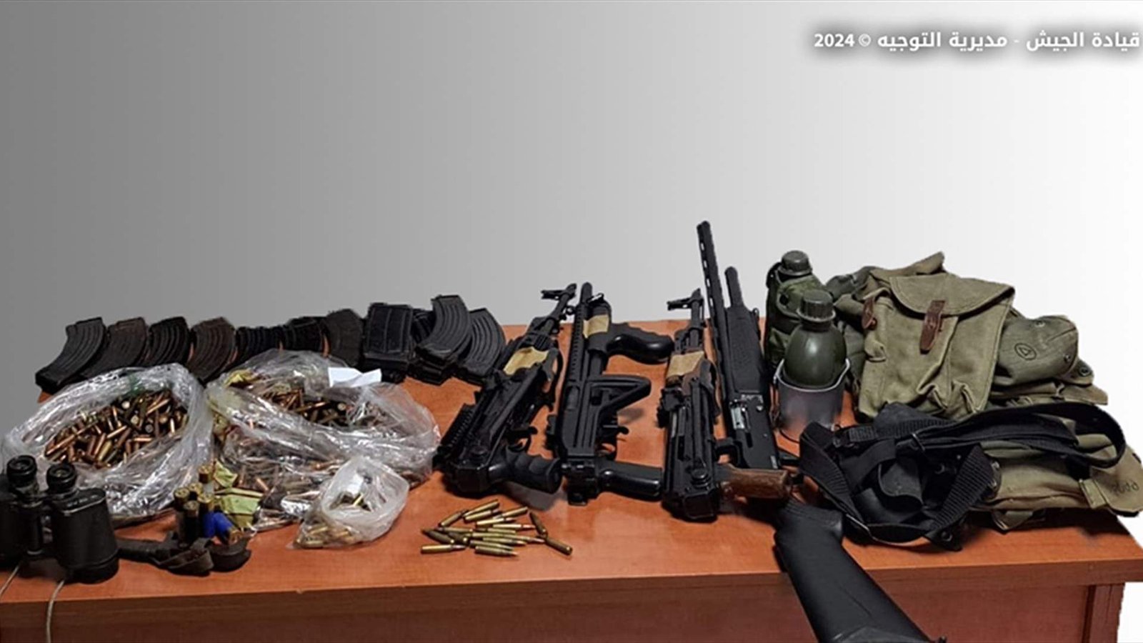 بتاريخ 3/5/2024، أوقفت دورية من مديرية المخابرات في منطقة المتين المزاريع – المتن المواطن (ي.ر.) لإقدامه على إطلاق النار في الهواء من سلاح حربي، وضبطت في حوزته كمية كبيرة من الأسلحة والذخائر، بالإضافة إلى أعتدة عسكرية.