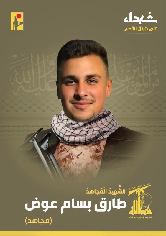 بمزيد من الفخر والإعتزاز، تزف المقاومة الإسلامية الشهيد المجاهد طارق بسام عوض “مجاهد” مواليد عام ٢٠٠٣ من بلدة حولا في جنوب لبنان، والذي ارتقى شهيداً على طريق القدس.