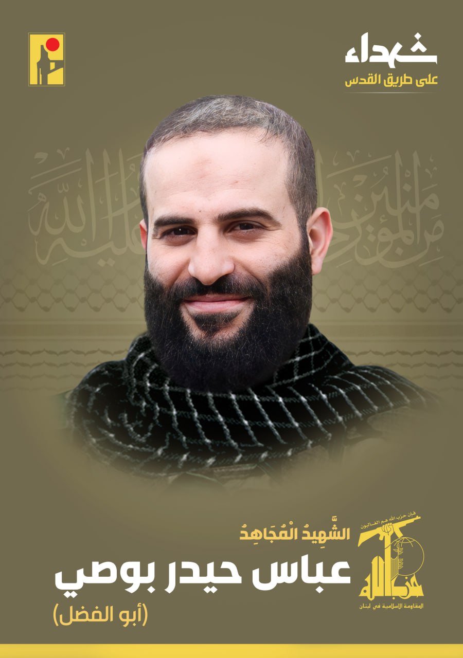 بمزيد من الفخر والإعتزاز، تزف المقاومة الإسلامية الشهيد المجاهد عباس حيدر بوصي “أبو الفضل” مواليد عام 1990 من مدينة بنت جبيل في جنوب لبنان، والذي ارتقى شهيداً على طريق القدس.