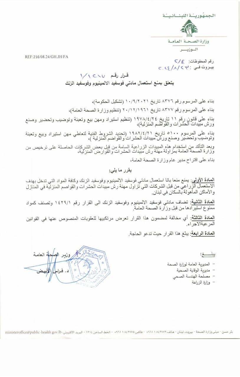 كذلك صدر عن الوزارة قرار يمنع منعًا باتًا إستعمال مادتي فوسفيد الألمينيوم وفوسفيد الزنك وكافة المواد التي تدخل بهدف الإستعمال الزراعي من قبل الشركات التي تزاول مهنة رش مبيدات الحشرات والقواضم المنزلية في المنازل والأماكن المأهولة بالسكان في لبنان.