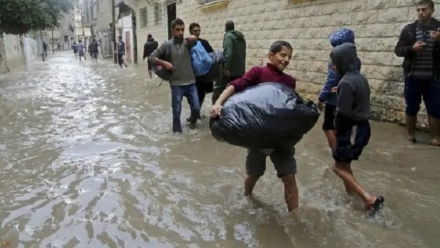 تسببت الأمطار الغزيرة في حدوث فيضانات واسعة في قطاع غزة الذي دمرته الحرب، وانتشرت صور جرى تداولها من مخيمات اللاجئين الفلسطينيين تظهر أطفالا يسبحون حفاة في برك من الماء والطين.