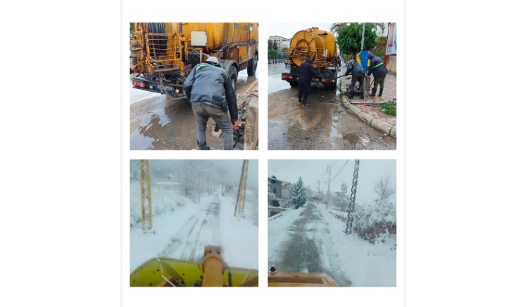 تابع وزير الأشغال العامة والنقل في حكومة تصريف الأعمال الدكتور علي حميه ، عمل مراكز جرف الثلوج التابعة لوزارة الأشغال العامة والنقل على فتح الطرق دون توقف على مدار الساعة.