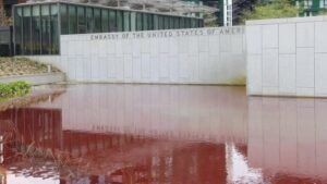 ناشطون في لندن يصبغون بركة أمام السفارة الأميركية بلون الدم احتجاجًا على دعم العدوان على غزّة.