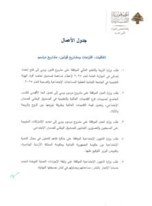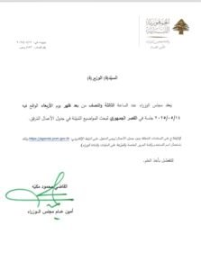 يعقد مجلس الوزراء، الثالثة والنصف من بعد ظهر الأربعاء، جلسة في القصر الجمهوري، للبحث في المواضيع المبينة في جدول الأعمال المرفق أعلاه.