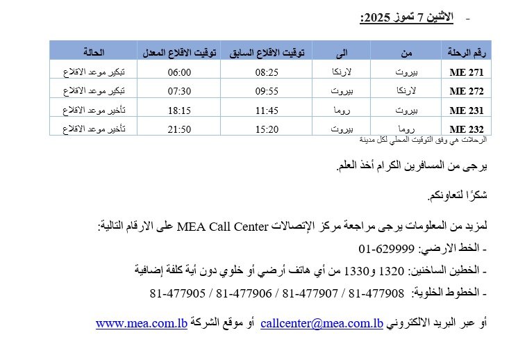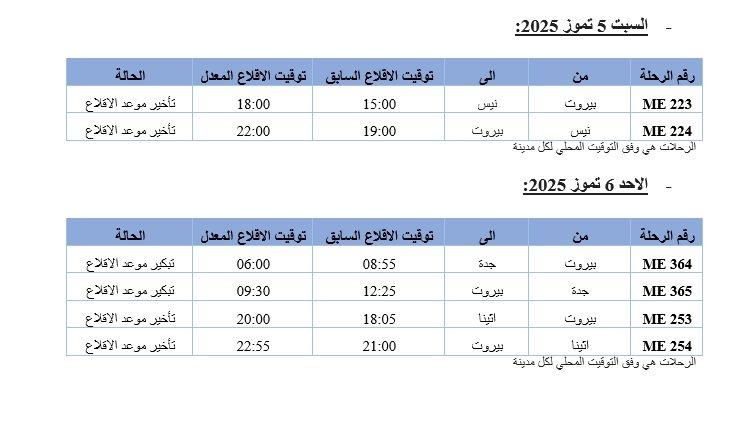 تُعلن شركـة طيران الشرق الأوسط – الخطوط الجوية اللبنانية عن تعديل جدول رحلاتها لأيام 5 و 6 و7 تموز 2025 لاسباب تشغيلية، حيث سيتم: