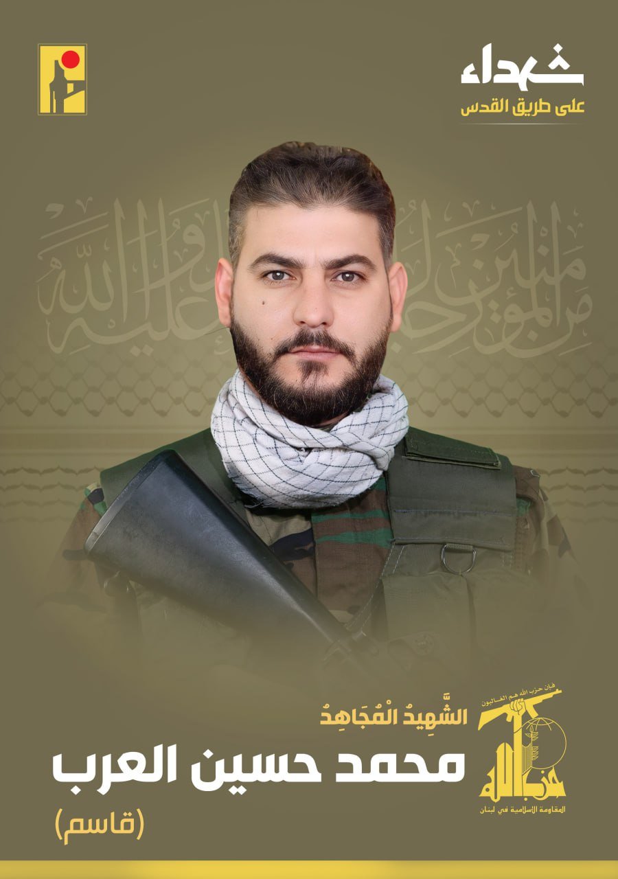 بمزيد من الفخر والإعتزاز، تزف المقاومة الإسلامية الشهيد المجاهد محمد حسين العرب “قاسم” مواليد عام 1979 من بلدة فلاوي في البقاع، والذي ارتقى شهيداً على طريق القدس.