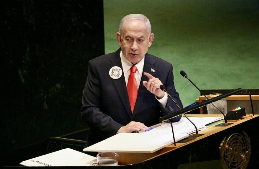 افتتح خطاب رئيس الوزراء الإسرائيلي بنيامين نتنياهو في قاعة الجمعية العامة للأمم المتحدة في نيويورك بضجة واحتجاجاتٍ واسعة.