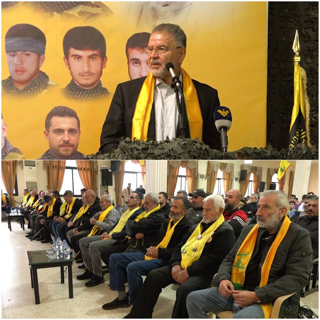 بعد تلاوة آيات من القرآن الكريم، ألقى النائب فياض كلمة حزب الله، فأشار إلى أنه من الواضع ارتفاع وتيرة الضغوطات على لبنان على مستويات مختلفة، ففي حين يمضي العدو الإسرائيلي في عمليات الإغتيال الجوي التي تستهدف المواطنين بمن فيهم المدنيين، وتدمير المنشآت بما فيها المنشآت السياحية، كما حصل في طيرفلسيه، واستهداف الآليات التي تعمل في ترميم المنازل وإزالة الردميات، بهدف منع عودة الأهالي إلى قراهم الحدودية، ثم يتوِّج كل ذلك، بالتهديد اليومي المتكرر بالعودة إلى الحرب مجدداً، يلاقي الأميركي هذا بالضغوطات السياسية والإقتصادية والمالية التي يمارسها، فيمنع إعادة الإعمار بكل وضوح وصلافة، ويربط السماح بذلك بنزع سلاح المقاومة، ولا تقف الضغوطات الأميركية عند هذا الحد، بل تمارس سياسة الخنق والإطباق والحصار المالي.