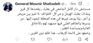 أشار الجنرال منير شحادة في تغريدة له على منصة إكس إلى أن مستشفى دار الأمل الجامعي في بعلبك يُعدّ صرحاً طبياً مميزاً في المنطقة، إذ يقصده مرضى من كل قرى وبلدات قضاء بعلبك-الهرمل ومن جميع الطوائف، موضحاً أنه لا يميز بين مريض وآخر.