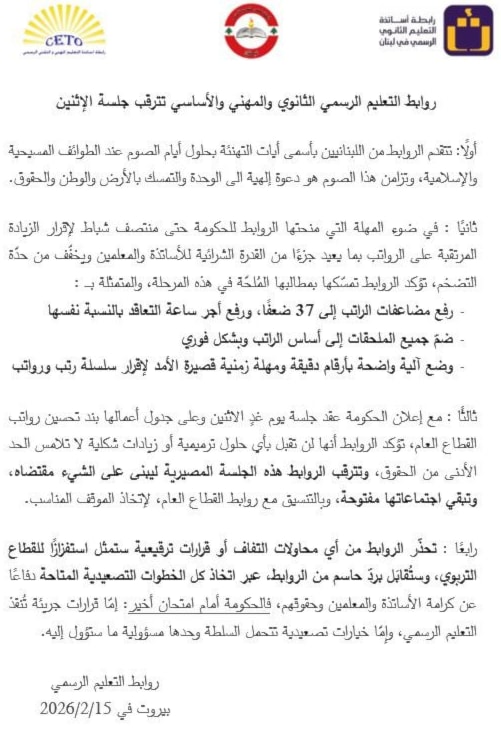 ويذكر هنا أنّ روابط التعليم طالبت في بيانها بمضاعفة الراتب إلى 37 ضعفاً (راتب الموظف في القطاع العام مضاعف 13 مرّة)، ورفع أجر الساعة بالتعاقد بالنسبة نفسها، فضلاً عن ضمّ جميع الملحقات إلى أساس الراتب وبشكل فوري.
