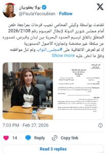 كتبت النائبة بولا يعقوبيان في منشور على حسابها عبر منصة “إكس” أنها تقدّمت، بواسطة وكيلها المحامي نجيب فرحات، بمراجعة طعن أمام مجلس شورى الدولة لإبطال المرسوم رقم 2026/2108 المتعلّق باتفاق ترسيم الحدود البحرية بين لبنان وقبرص.